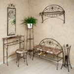 Если площадь небольшая, то можно использовать лишь массивные кованые элементы. Например, металлическая вешалка, полка или оправа зеркала. Учтите, что используя ковку можно сохранить износившеюся старую мебель. К старой вешалке добавить кованые крючки, к табурету или пуфику — ножками из металла.